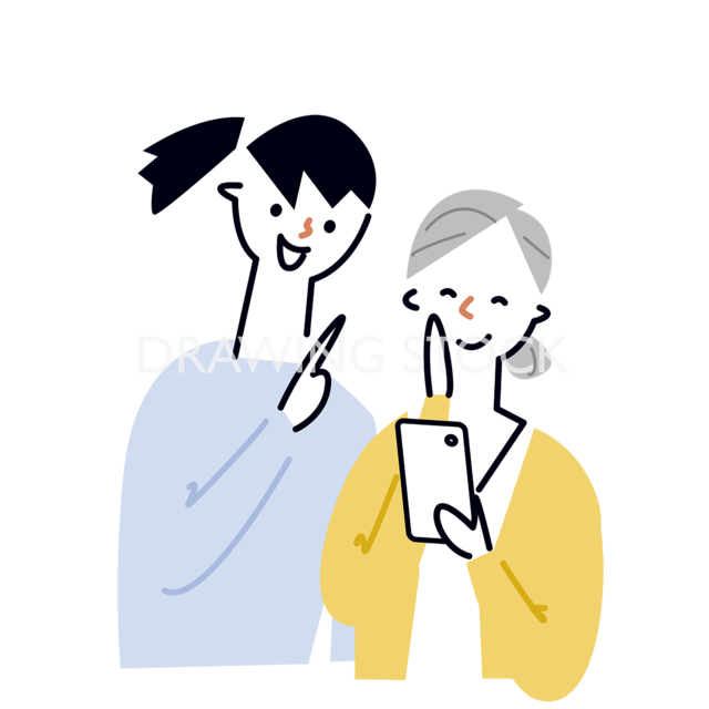 # 商品説明文:いっしょにスマホを見る祖母と孫娘 3点セット 本素材は、現役のプロイラストレーターによる商用利用可能なストックイラストです。 いっしょにスマホを見ている祖母と孫娘のイラストを3点セットで収録しています。 家族や親子の絆を描く記事、Web・印刷物・SNS投稿用のカット素材としてご活用いただけます。 背景のないPNG形式(300dpi)で、編集やレイアウトにも適したデータです。 ※商用利用OK ※高解像度、その他アイテムへのご希望はCONTACTよりお問い合わせください。 ※drawingstockロゴはサンプル画像のみ、ダウンロードデータには含まれません。 ※著作権は本サイトが所有しています。再販売・再配布・商標登録などは禁止です。