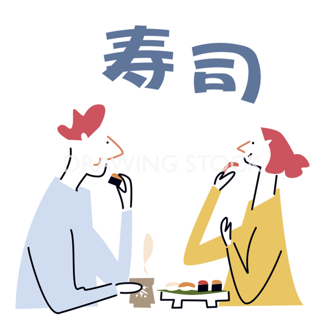 インバウンド、外国人の男女2人が寿司を食べている 本素材は、現役のプロイラストレーターによる商用利用可能なストックイラストです。 日常シーンや生活系の記事、Web・印刷物・SNS投稿用のカット素材としてご活用いただけます。 背景のないPNG形式(300dpi)で、編集やレイアウトにも適したデータです。 ※商用利用OK ※高解像度、その他アイテムへのご希望はCONTACTよりお問い合わせください。 ※drawingstockロゴはサンプルのみ、ダウンロードデータには入っていません ※著作権は本サイトが所有しています。再販売・再配布・商標登録などは禁止です。