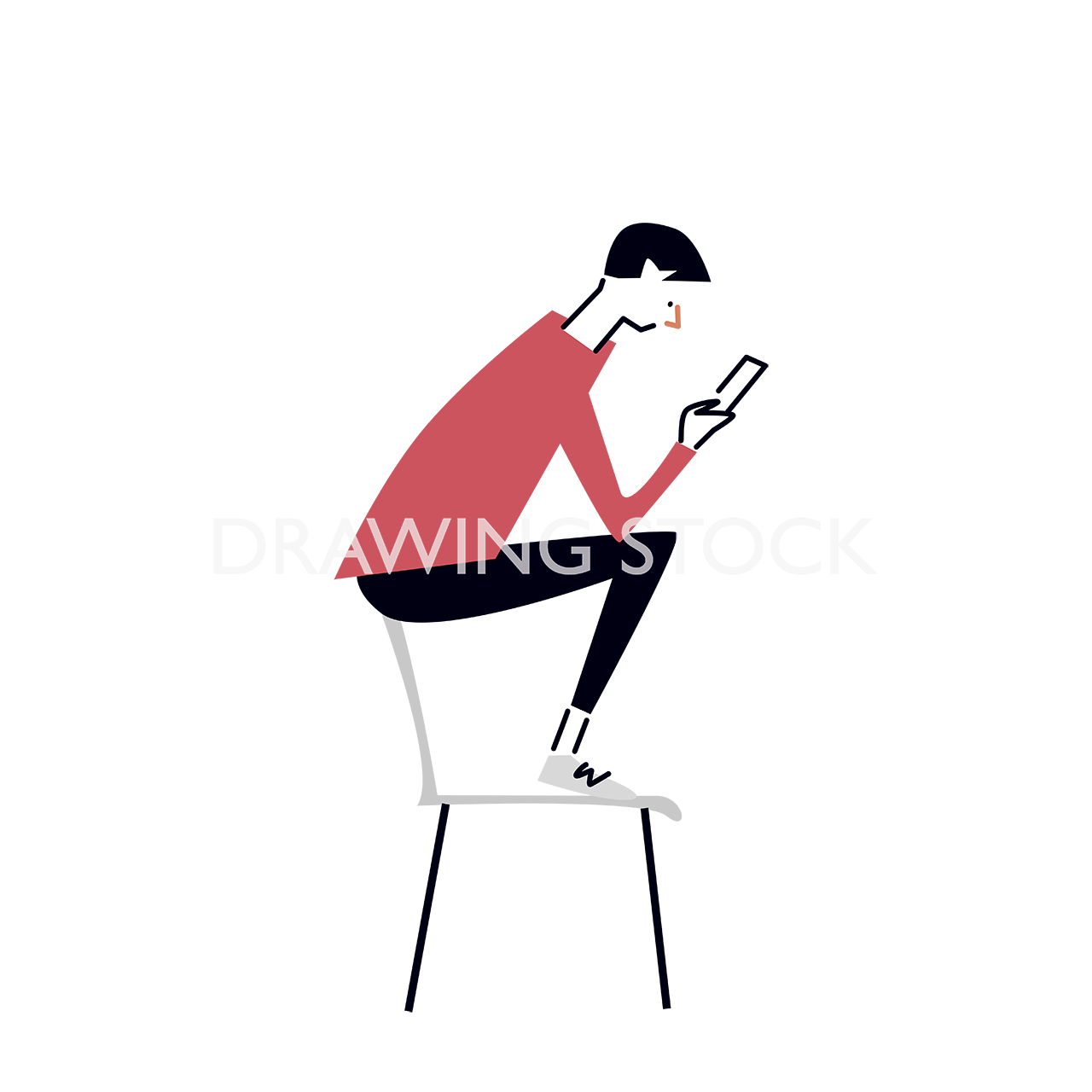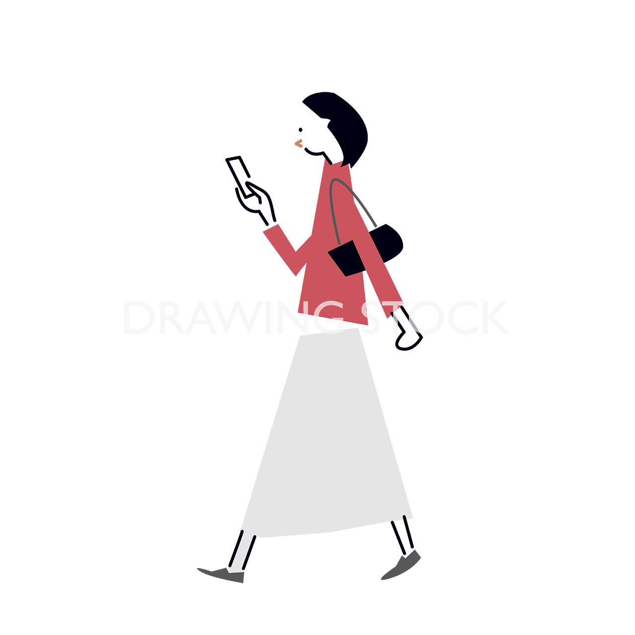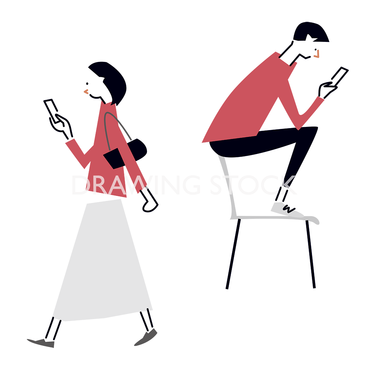 座ってスマホを見ている男性と、歩きながらスマホを見る女性のイラストを3点セットで収録しています。