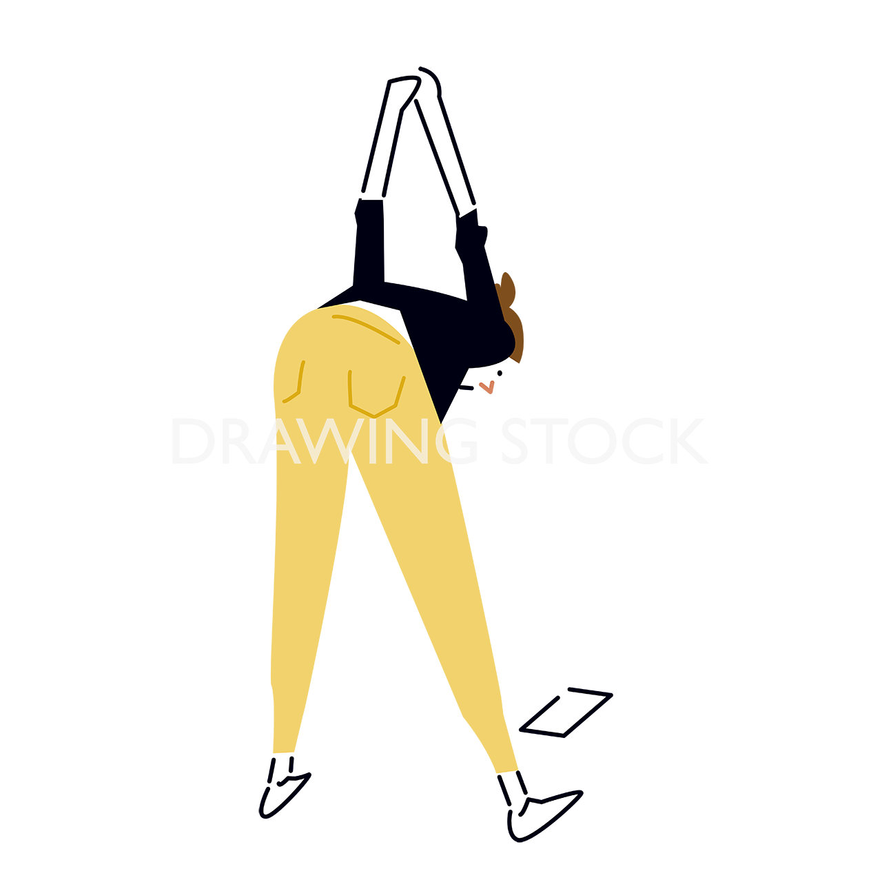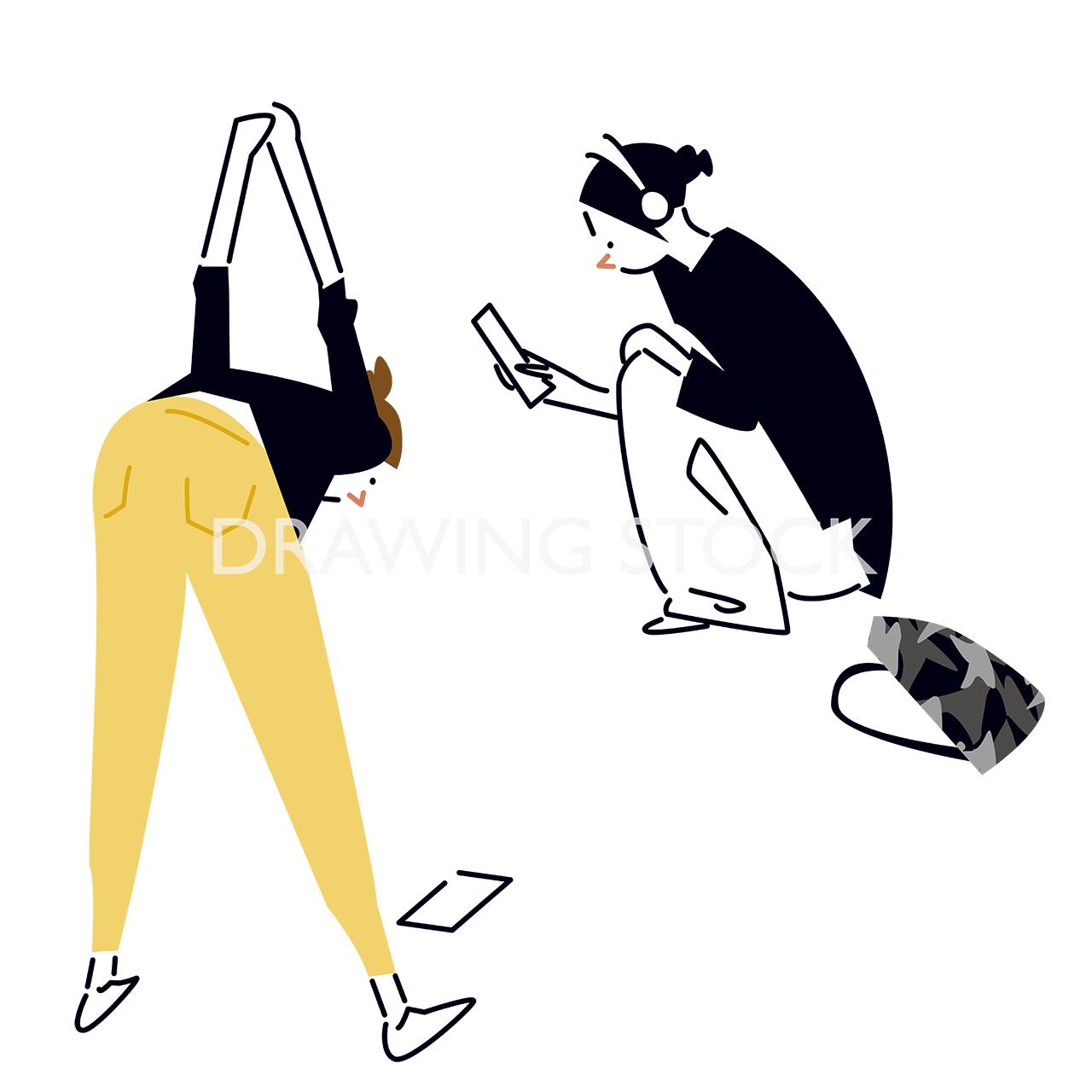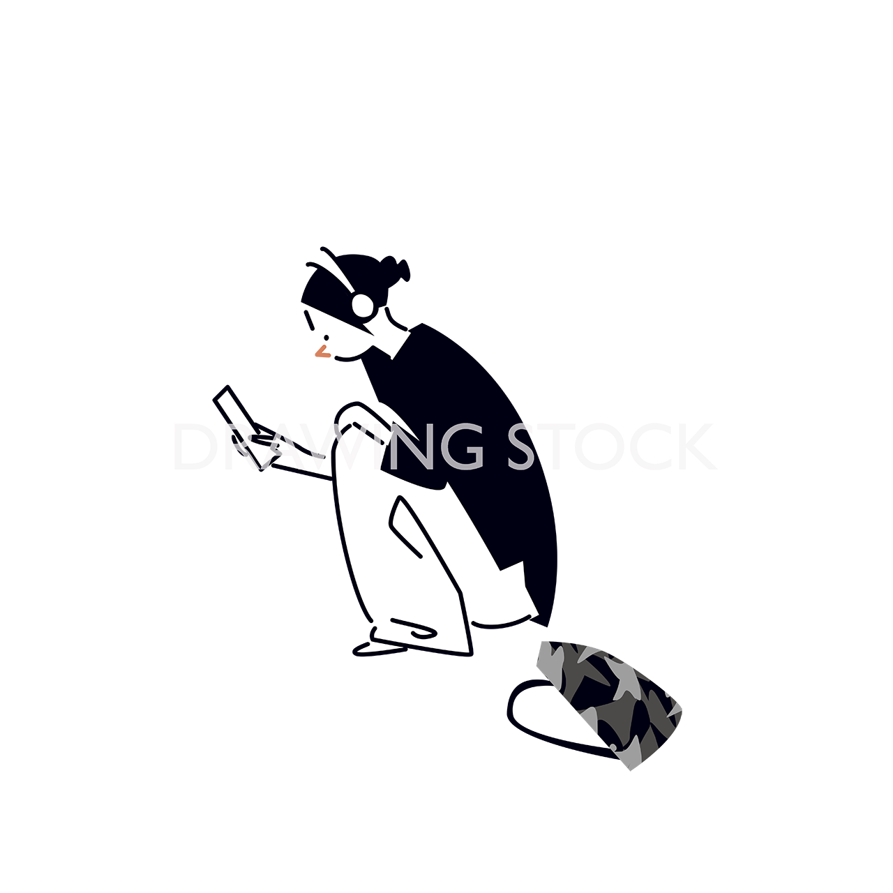 ストレッチしながらしゃがんでスマホを見る女性のイラストを3点セットで収録しています。