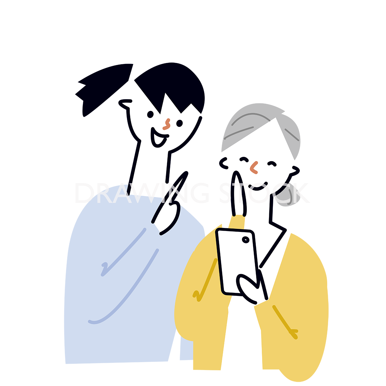 いっしょにスマホを見ている祖母と孫娘のイラストを3点セットで収録しています。
