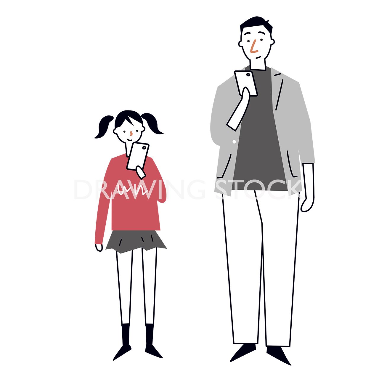 親子、父と娘が立ってスマホを見ている