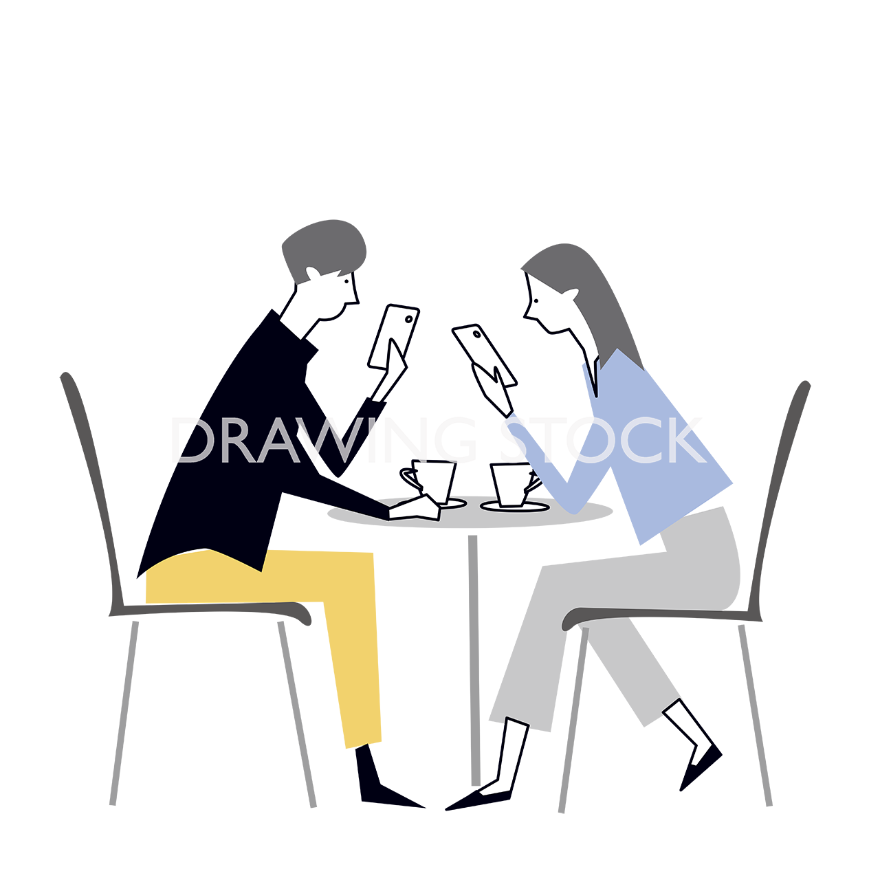 若い男女がテーブルを挟んでスマホを見ながら会話している