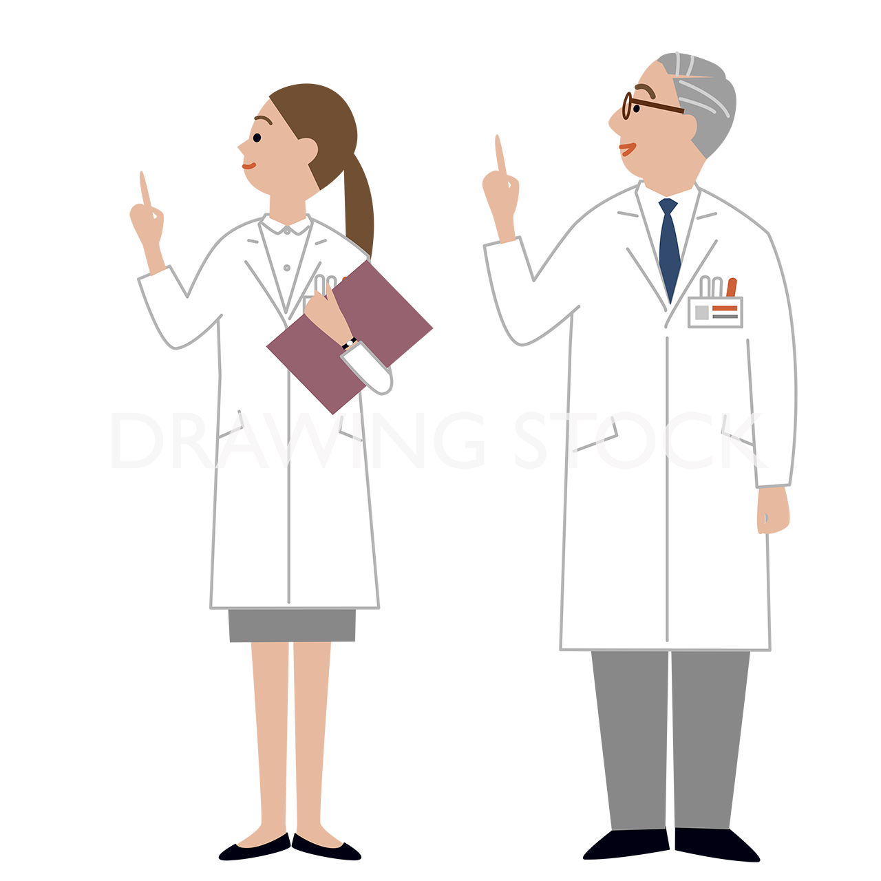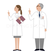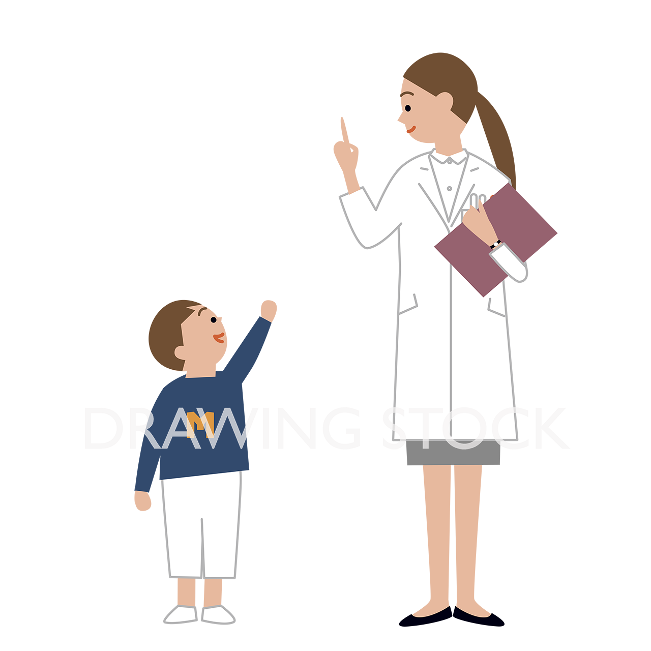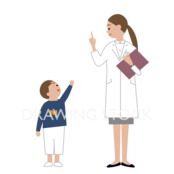 横向いて指で指し示す男女の医師と答える男の子、正面バストアップ