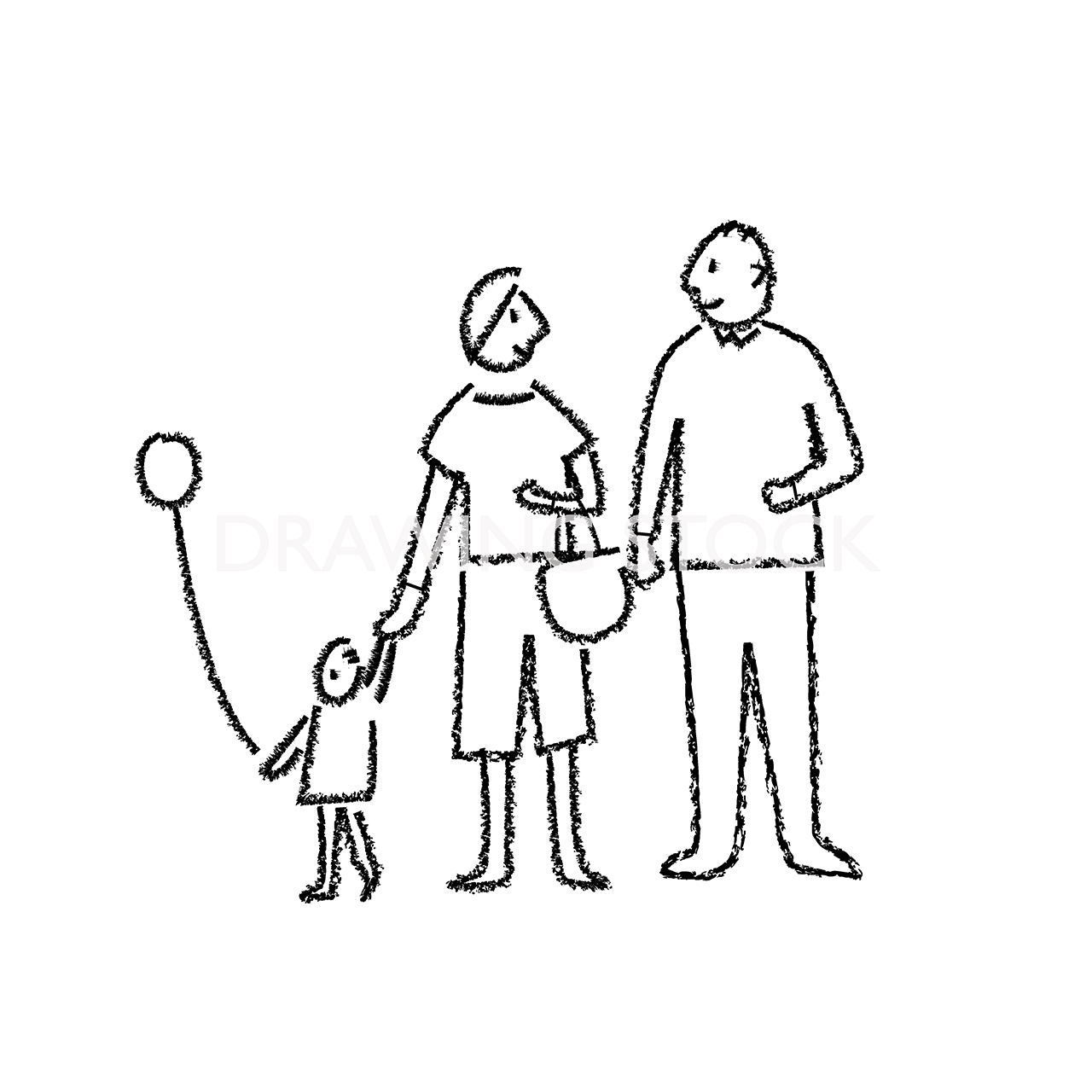 風船を持つ子どものいる3人家族の線画イラスト1点です。